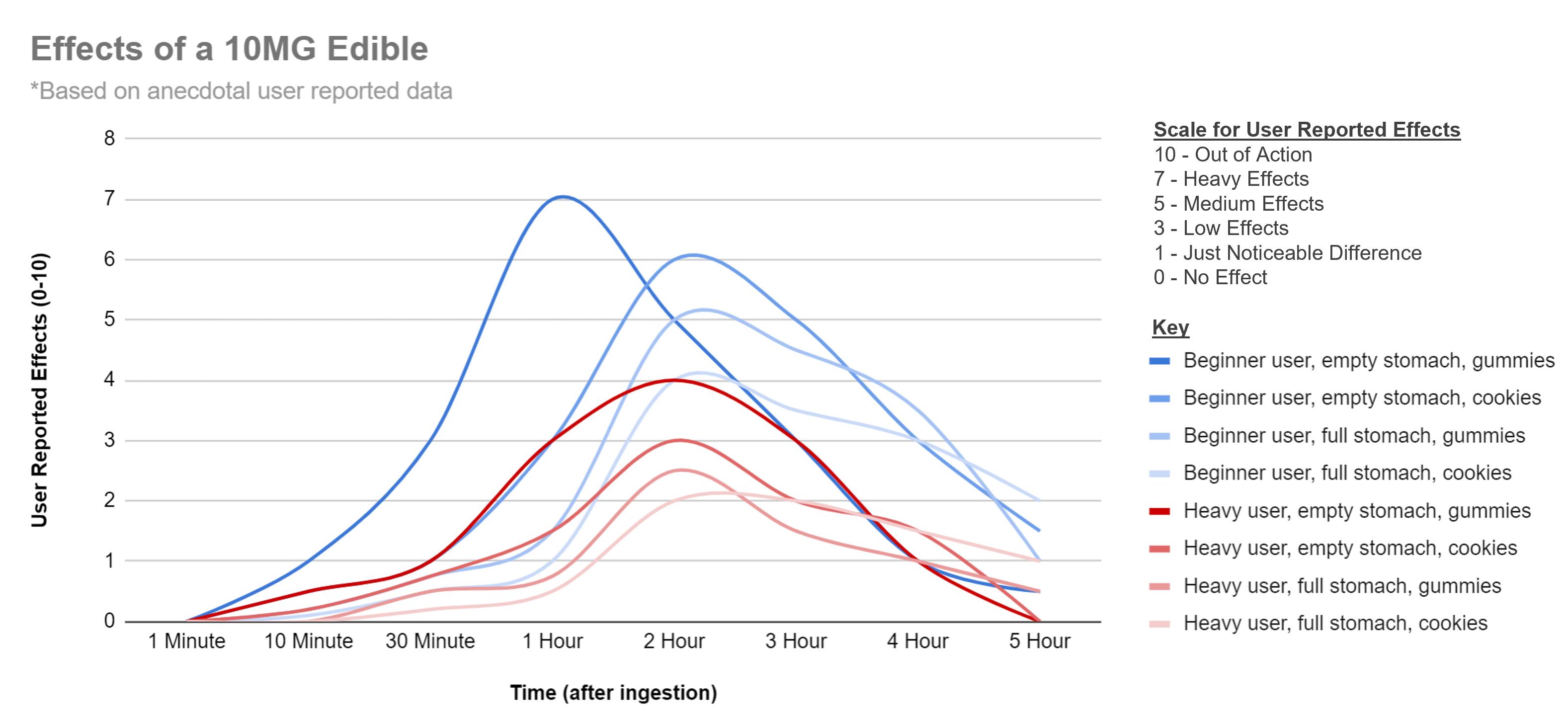 As you can see in the graph, the same dose of edibles (10mg of THC) can have a wide range of effects based on those factors. Edibles metabolize significantly faster on an empty stomach: you'll start to feel the effects quickly (~15-45 minutes) and it will be more intense, but it won’t last as long (2-3 hours). I typically take edibles on an empty stomach or right before a meal so that the effects are more predictable. If you've just had a full meal on the other hand, it will take time for your body to digest and absorb the THC, and so the effects will be delayed (up to 1.5-2 hours), less intense, and last longer (up to 4-5 hours for higher doses). The type of edible has a significant impact as well: simple sugar-based edibles like mints, hard candy, or gummies, are the fastest to digest and typically hit the fastest. More complex edibles like chocolates, baked goods, or other infused foods take longer to digest and their effects usually take a longer time to be felt.